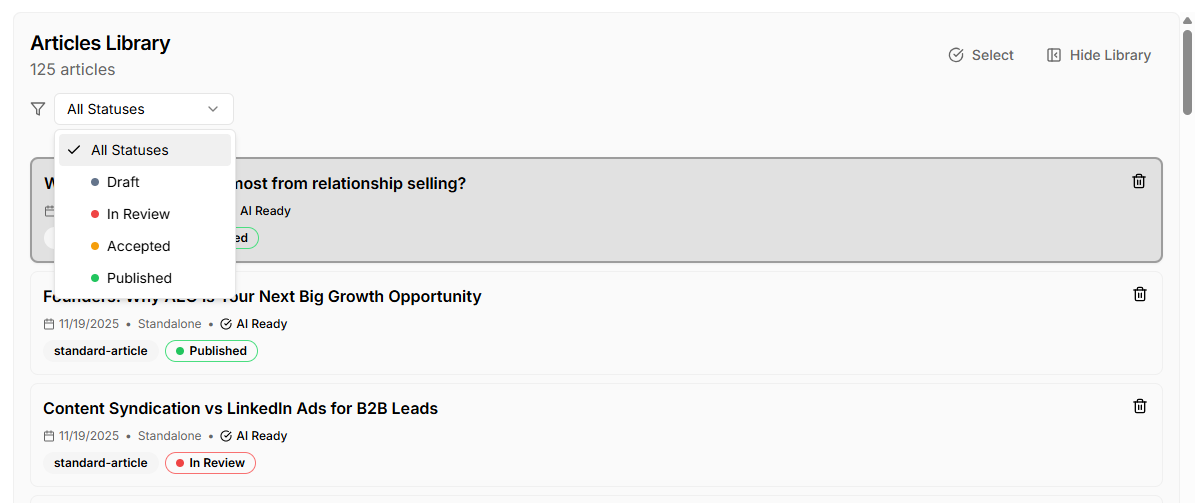 Change status without context-switching: Update article status directly from the library—no more toggling between views